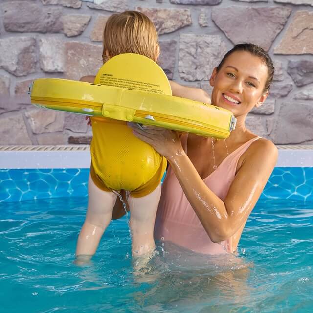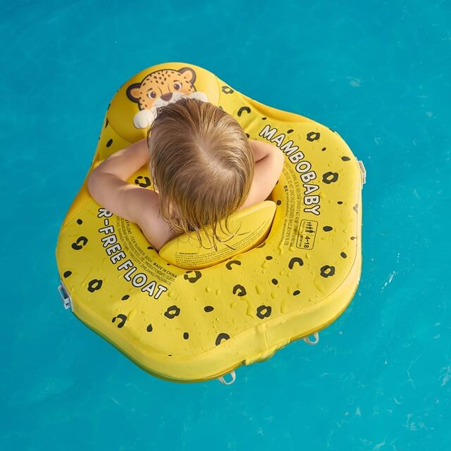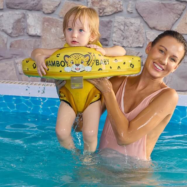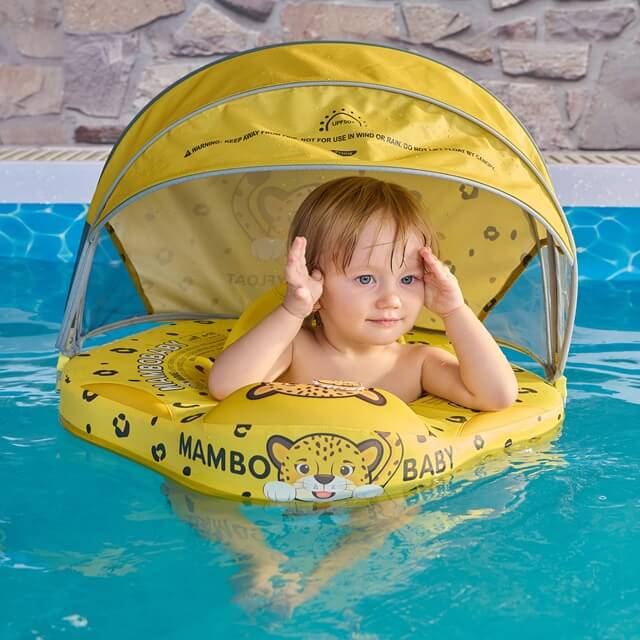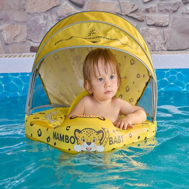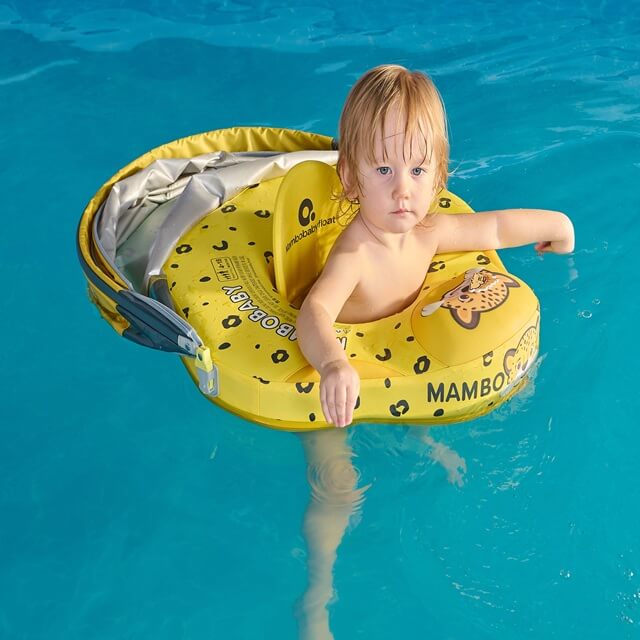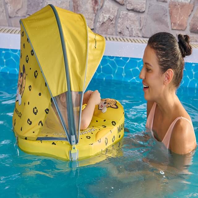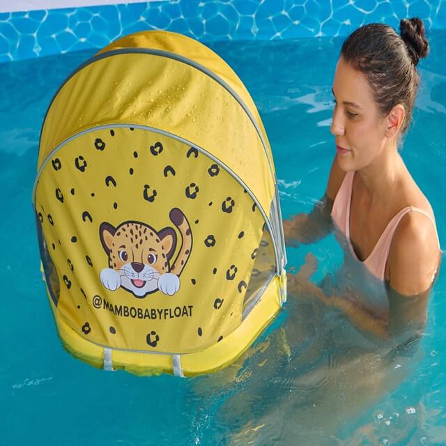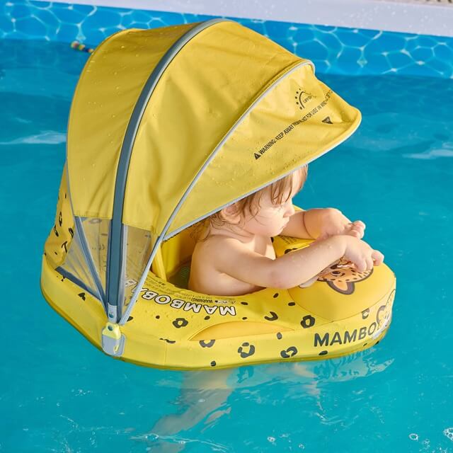 The Mambobaby seat float with canopy is a baby swimming aid designed to help infants sit safely in the water while being supported and shaded from the sun.